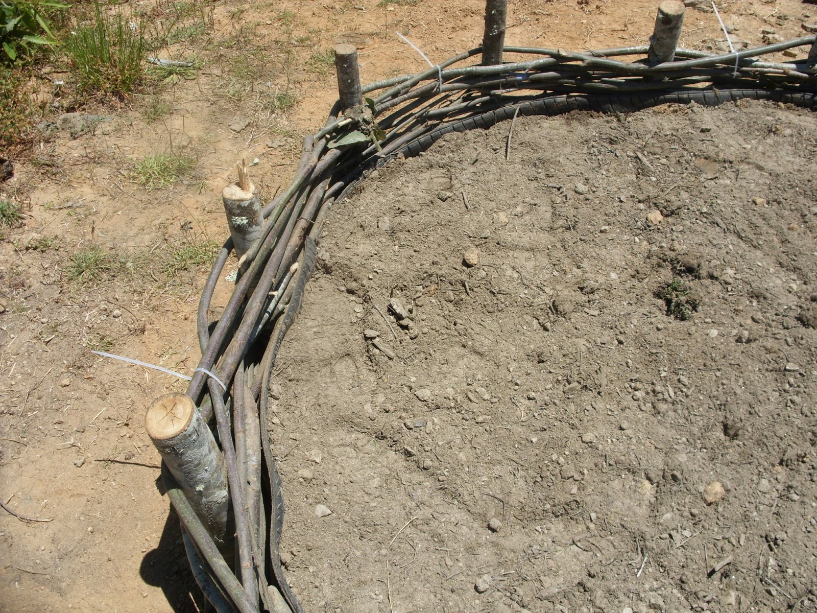 O passo seguinte passou por enterrar no chão vários esteios de castanho, equitativamente distribuídos no perímetro da circunferência. Posteriormente, entre os postes, entrelacei diversos ramos finos.